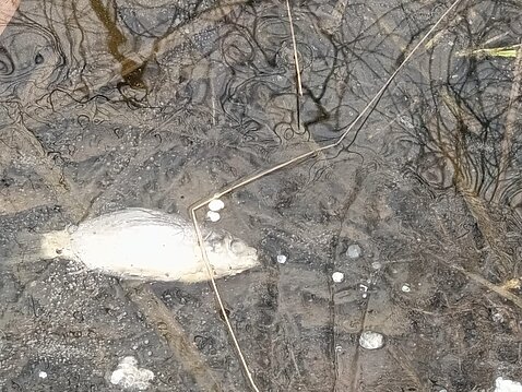 Insbesondere in flachen Gewässern ohne großen Durchfluss können Fischverluste aufgrund von Ausstickung auftreten. Sollte man an einem Verbandsgewässer in nächster Zeit tote Fische feststellen, sind Informationen stets hilfreich.